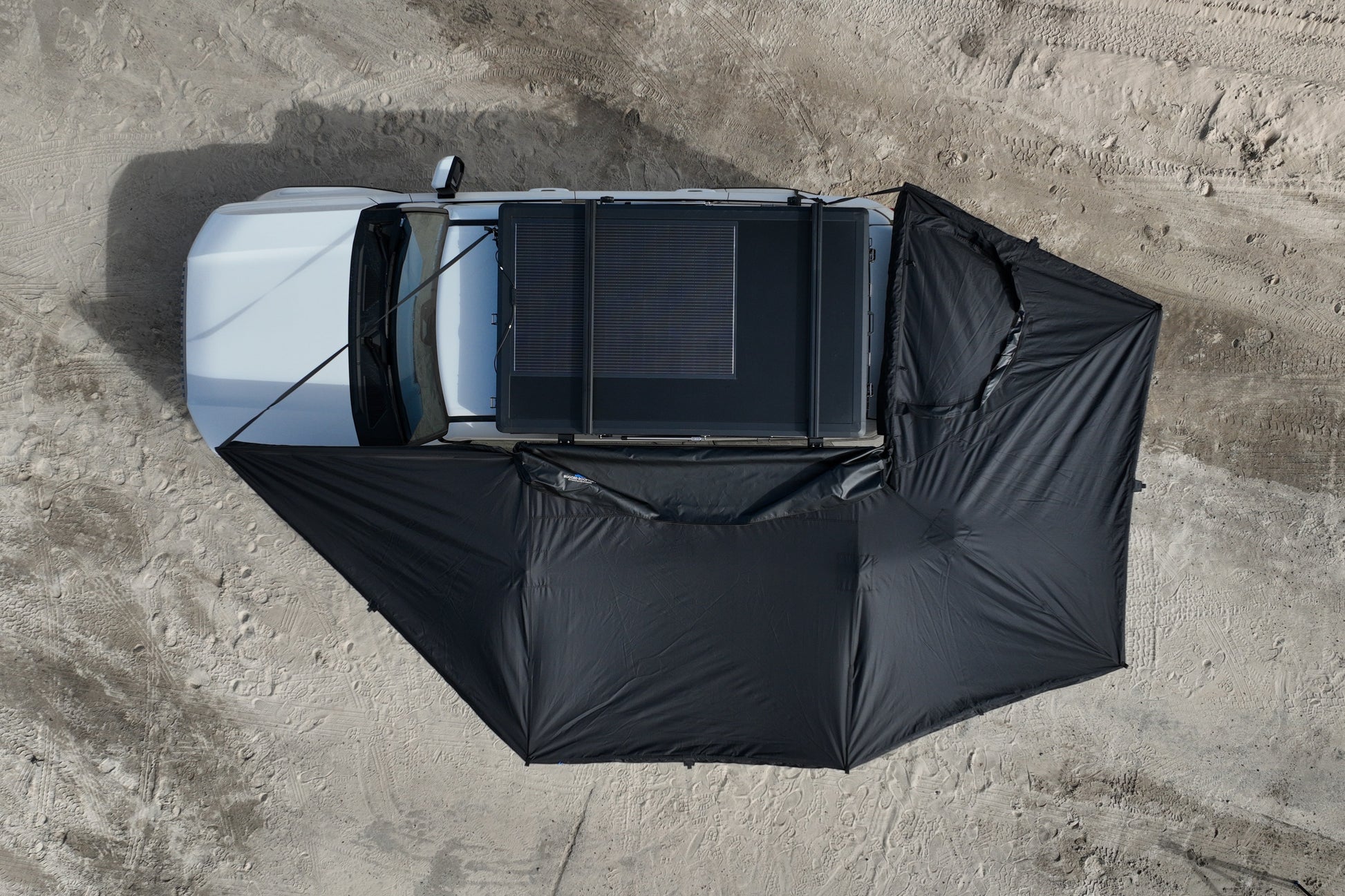The MAX version extends past a tradtional 270° Awning to give you extra cover around the car.